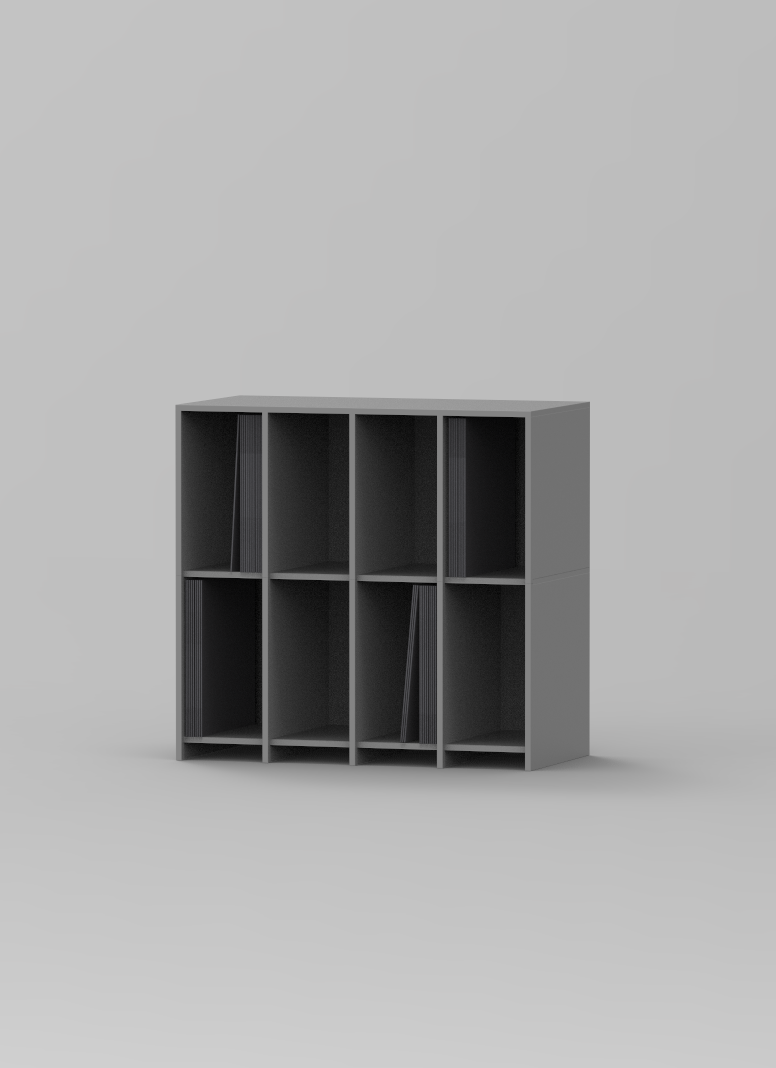 Four-bay shelf with generous depth for records and a clean, understated silhouette.
